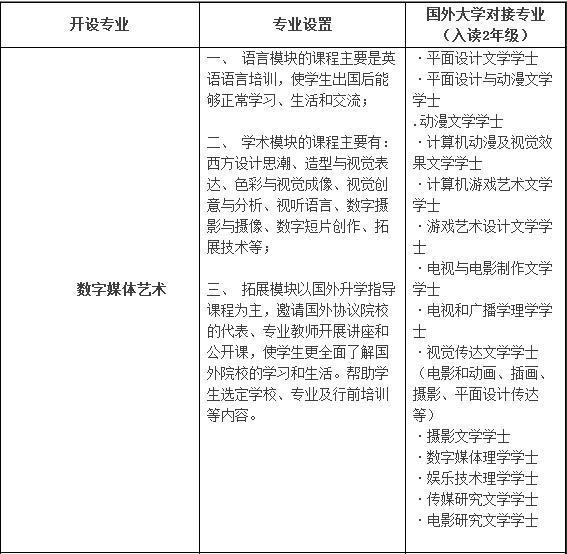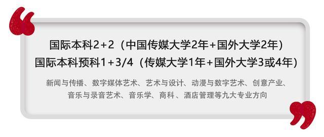为了满足更多学生留学海外的求学需求,在中国传媒大学和中国教育部留学生服务中心的支持与指导下,继续教育学部和国外多所高校签署协议,开设出国留学预备课程项目,学生在中国传媒大学学习两年,主要以语言培训为主、涉及个别基础技能的培训课程,及少量可获外方院校学分豁免的非核心课程/专业课程等,在中国传媒大学的阶段性学习结束后,成绩合格并符合国外大学入学要求的学生将可赴国外学习,注册国外大学学籍后,攻读国外院校相应的课程,成绩合格取得国外大学学士学位。