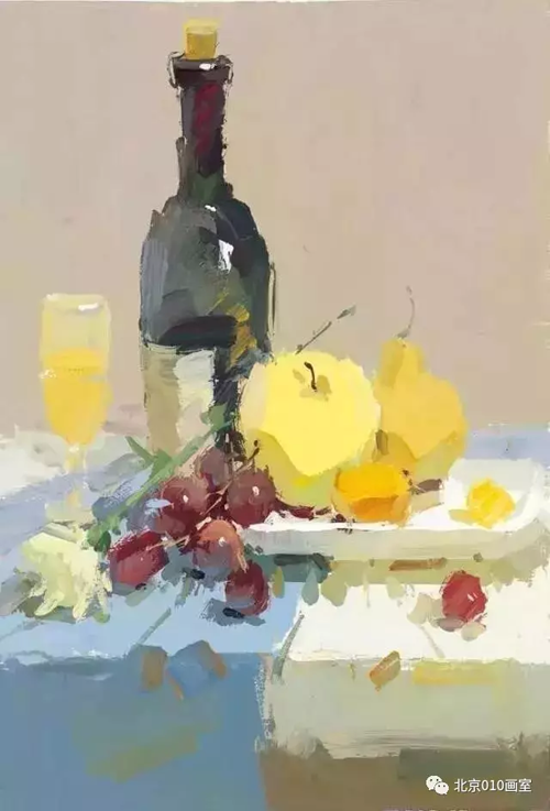 二、这个时候可以拿大笔把背景,衬布铺上颜色,这里要注意冷暖、前后虚实的区分,背景不能画得太“跳”,然后用中号笔把所有静物的颜色铺一遍,一般是铺亮面的颜色,整幅画面铺满之后再把所有静物、衬布的暗面画出来,这个时候下笔果断一点,不要觉得过渡生硬,因为这一步你还没有画静物的固有色,所以过渡生硬是可以理解的,然后下一步就是画固有色了,如果你在这一步之后就点高光,那么这幅画就是一副小色稿,所有的静物虽然没有塑造,但是体积、色调都有了,一幅画的基调也就定好了。