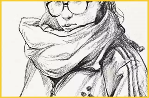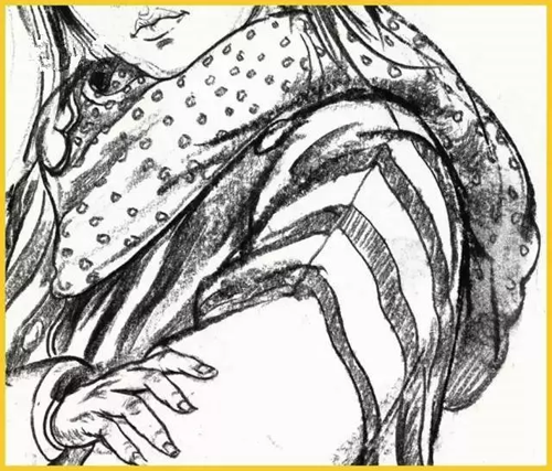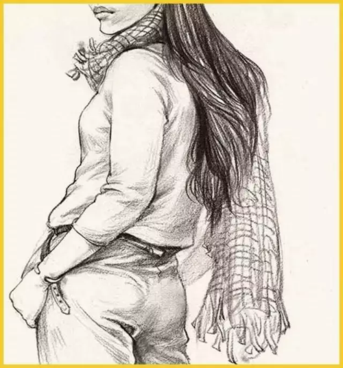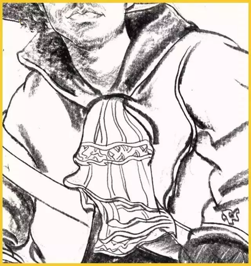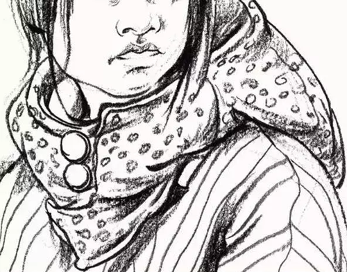 衣领:衣领的画法是对颈肩衔接的交代,也是整个画面的支撑。人体结构与运动也决定着衣纹的变化画衣领时要抓住形体转折的衣纹来着重表现, 尽量将颈部和肩部之间的前后和衔接关系处理好。并且, 还要尽量通过衣纹的变化暗示出下方的骨骼和肌肉的基本形。