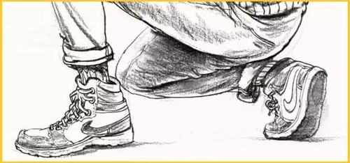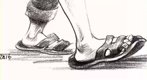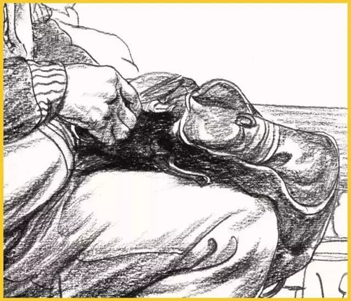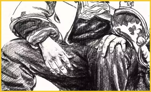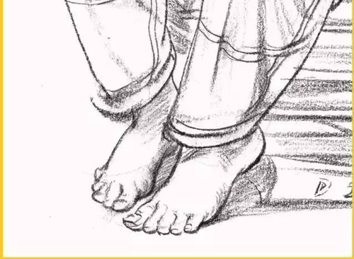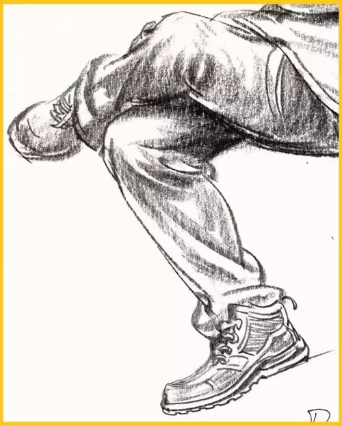 腿部:腿部无论从正面还是从侧面看,轮廓都不是直的,而是高低起伏的曲线。所以腿部衣纹的表现要与大腿的结构转折和运动方向一致,同时注意表现手法的多样性。膝关节部位是腿部产生衣纹的关键点,通常支起的膝盖部位形成了凸出的点,衣纹以此为核心,向大、小腿方向以长短、宽窄不同的褶纹呈放射状扩散。画脚要注意其外形及与腿的上下贯通,腿与脚不必分开画。