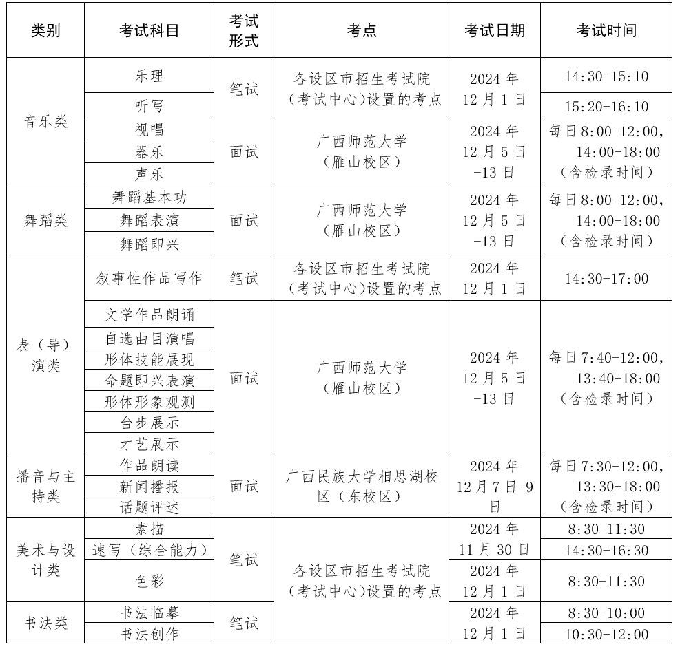 各省美术高考分站广西2025年普通高校招生艺术类专业全区统一考试科目及考试时间表