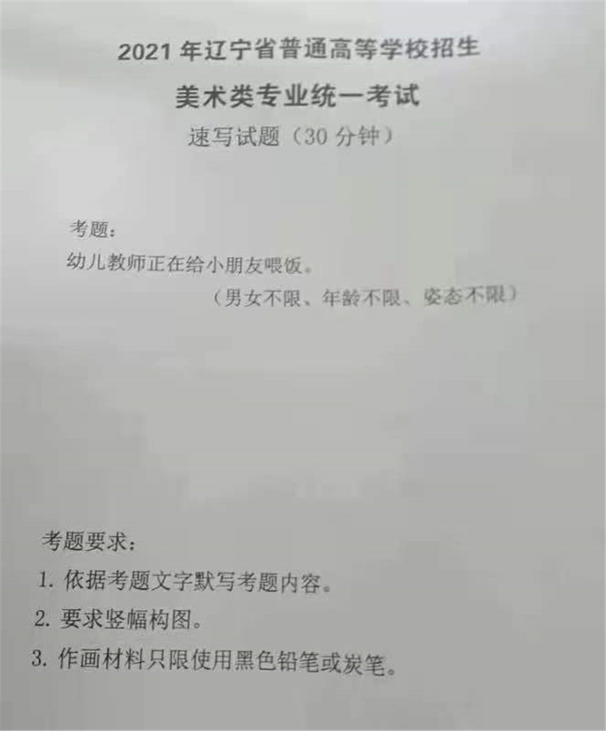 各省美术高考分站2021年辽宁美术联考定于2020年12月5日举行,素描:8:00—11:00;速写:11:40—12:10;色彩:13:30—16:30,各科考试满分均为100分,总满分为300分。