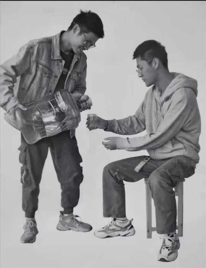 速写考题:双人速写,一个男学生(站姿)抱着大桶纯净水,另一个男学生(坐姿)拿着一次性水杯接水。