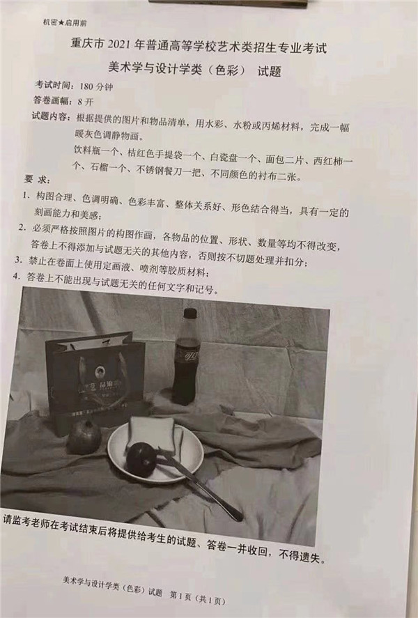 各省美术高考分站2021年重庆美术联考于2020年12月6日举行,考试科目为素描、速写、色彩,各科考试满分均为100分,总满分300分。