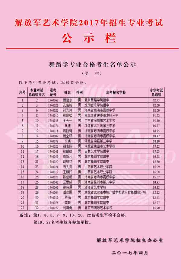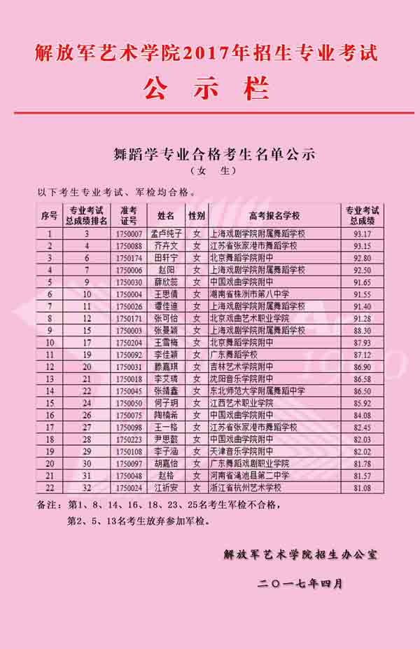 2017年解放军艺术学院舞蹈学专业考试合格名单