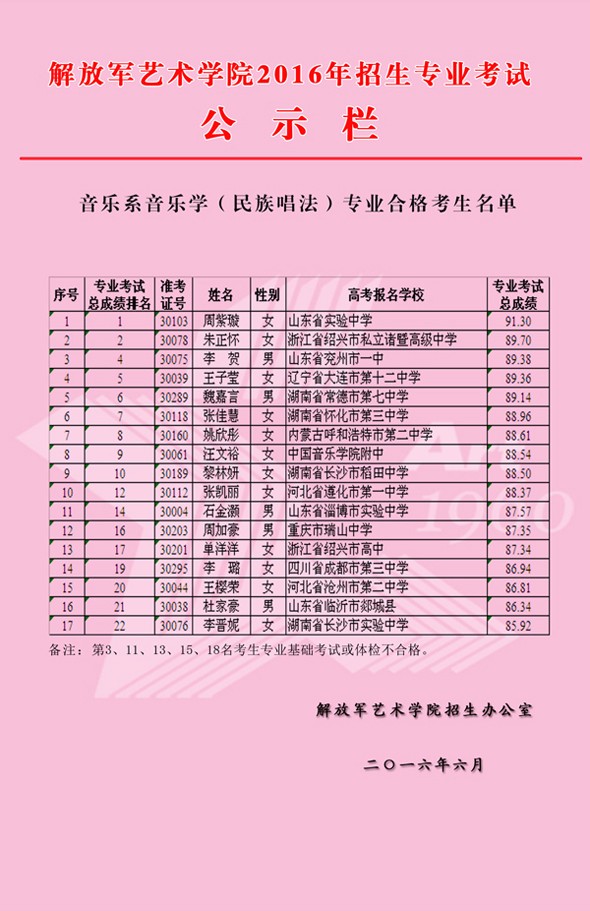 2016年解放军艺术学院音乐学专业合格名单