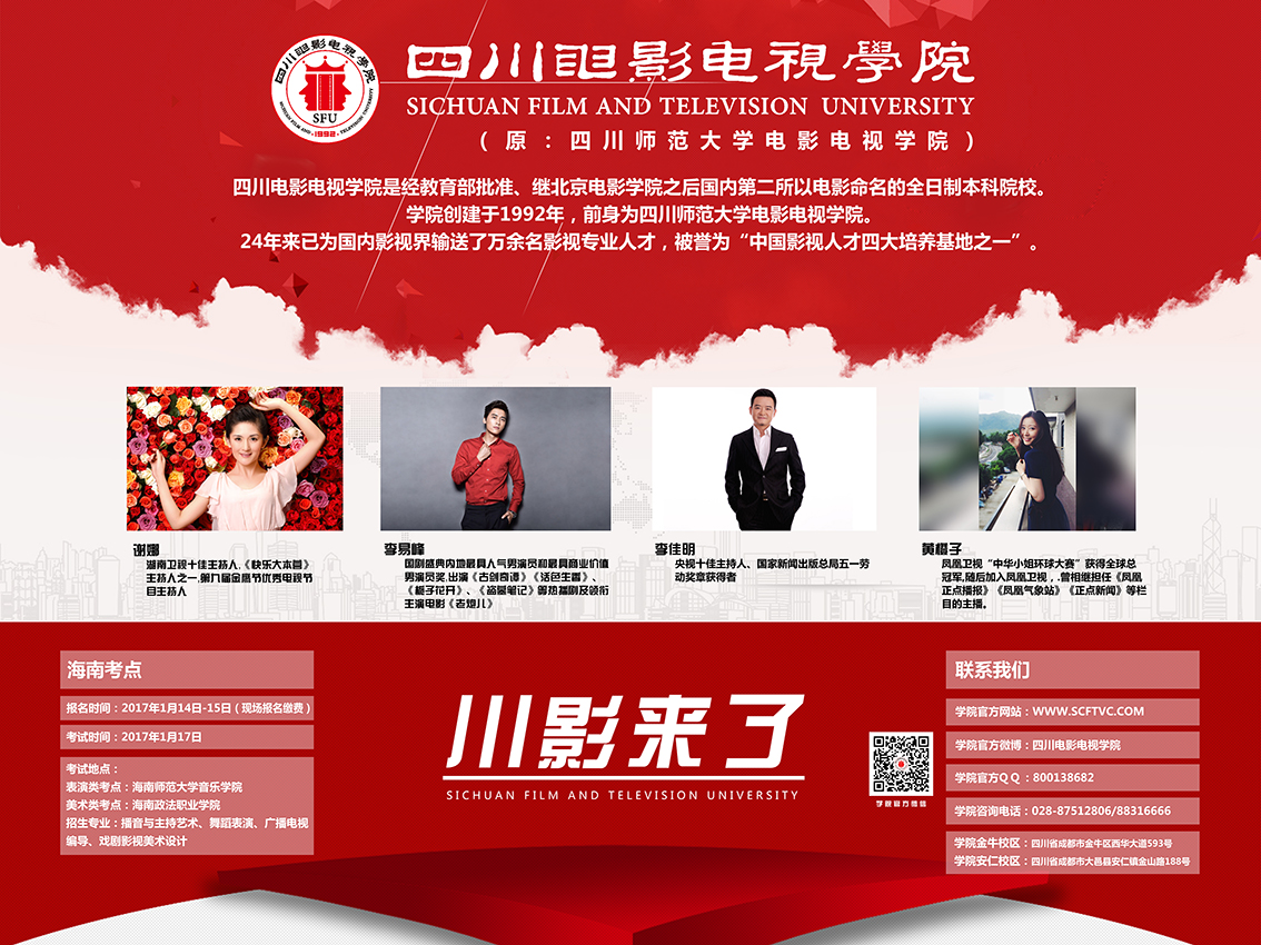 | 播音与主持艺术 | 上镜、播音测试、即兴主持 | 1月14日—15日,海南师范大学 | 海南师范大学 | 1月17日 | 028-87512806 |