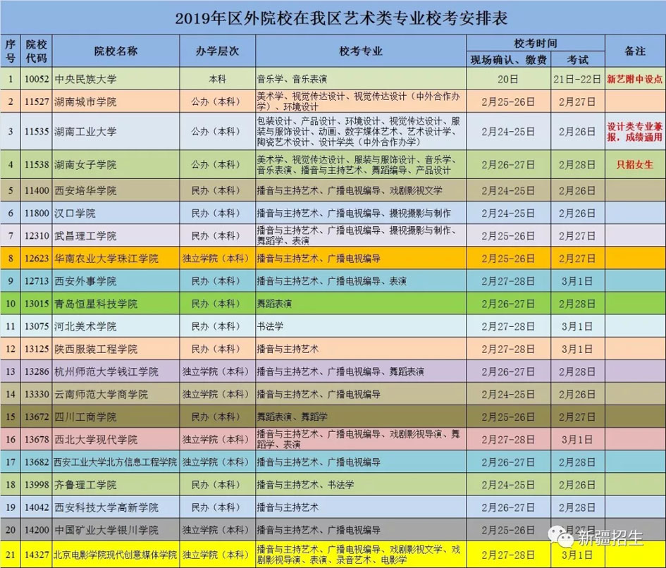 除中央民族大学在新疆艺术学院附属中等艺术学校组织校考外,2019年区外院校在我区组织校考考点统一安排在新疆师范大学,考试时间:2019年2月24日—3月3日。各院校校考具体报名、考试时间见下表,艺术类考生可自行联系参加考试。