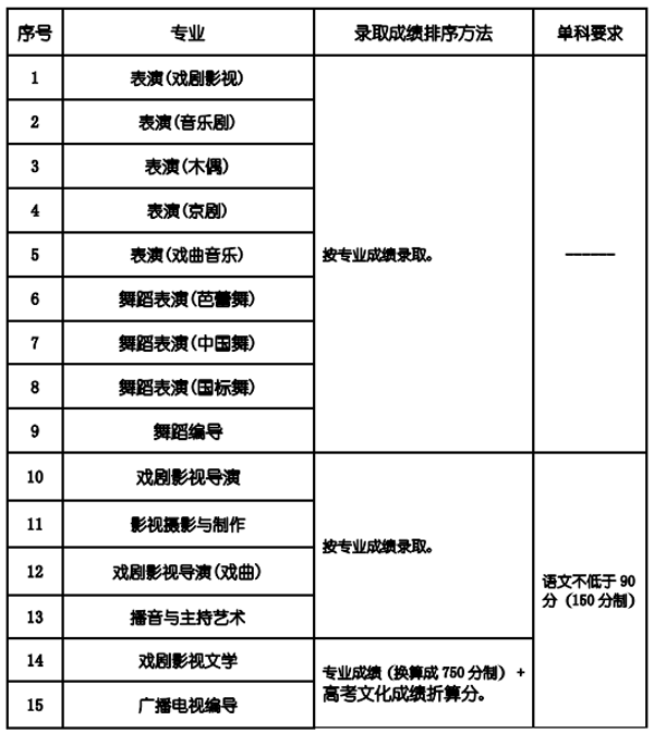 1、考生高考文化成绩不得低于所在省市艺术类同科类本科最低分数线,表演(京剧)、舞蹈表演专业可适当降低要求。