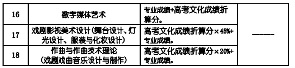 (一)根据教育部关于普通高等艺术院校招生的相关规定,我校可根据各专业(方向)合格人数,参照招生计划数,自行划定高考录取控制分数线,自划线办法按照教育部教学厅(2016)10号文件执行。凡我校专业考试合格,在自定高考录取控制分数线以上的考生分别按以下办法从高分到低分择优录取: