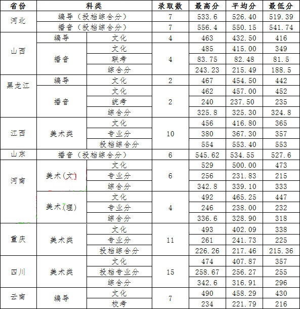 在无相应专业统考(联考)的省份,高考文化课成绩达到学校在生源所在省前述两专业录取批次最低录取控制分数线,并取得本校专业校考合格证前提下,投档至本校的考生,广播电视编导专业按文化课总分(排位分)排名从高到低,择优录取,文化课成绩相同时,专业校考成绩高者优先录取。播音与主持艺术专业按综合分从高到低择优录取,播音与主持艺术专业综合分=高考文化课成绩(含政策加分)×40%+专业校考成绩×60%,综合分相同时,按照专业校考、语文、数学、外语成绩顺序,从高分到低分排序,排序靠前的考生优先录取。
