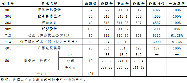 美术类专业考生高考文化成绩及美术统考专业成绩均需达到学校在生源所在省(区、市)美术类专业录取批次最低录取控制分数线,在考生符合专业要求的基础上,实行“专业志愿优先”的录取原则,不设置专业志愿级差。投档至本校的广东省生源考生,按投档总分排位情况从高分到低分择优录取;投档至本校的广东省外生源考生,按综合分从高到低择优录取,综合分=高考文化课成绩(含政策加分)×40%+美术术科统考成绩×60%,综合分相同时,按照美术术科统考、语文、数学、外语成绩顺序,从高分到低分排序,排序靠前的考生优先录取。
