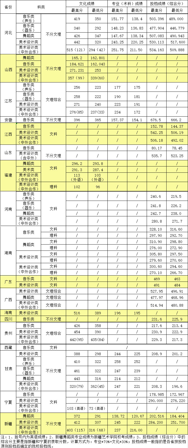 音乐学、舞蹈表演、美术学、环境设计和视觉传达设计等五个专业,按综 合成绩(高考文化成绩×30%+专业成绩×70%)从高到低排序录取,同分情况下 专业成绩高者优先录取;专业成绩相同的,依次按高考文化成绩的语文、数学、外语和综合成绩由高到低排序录取。