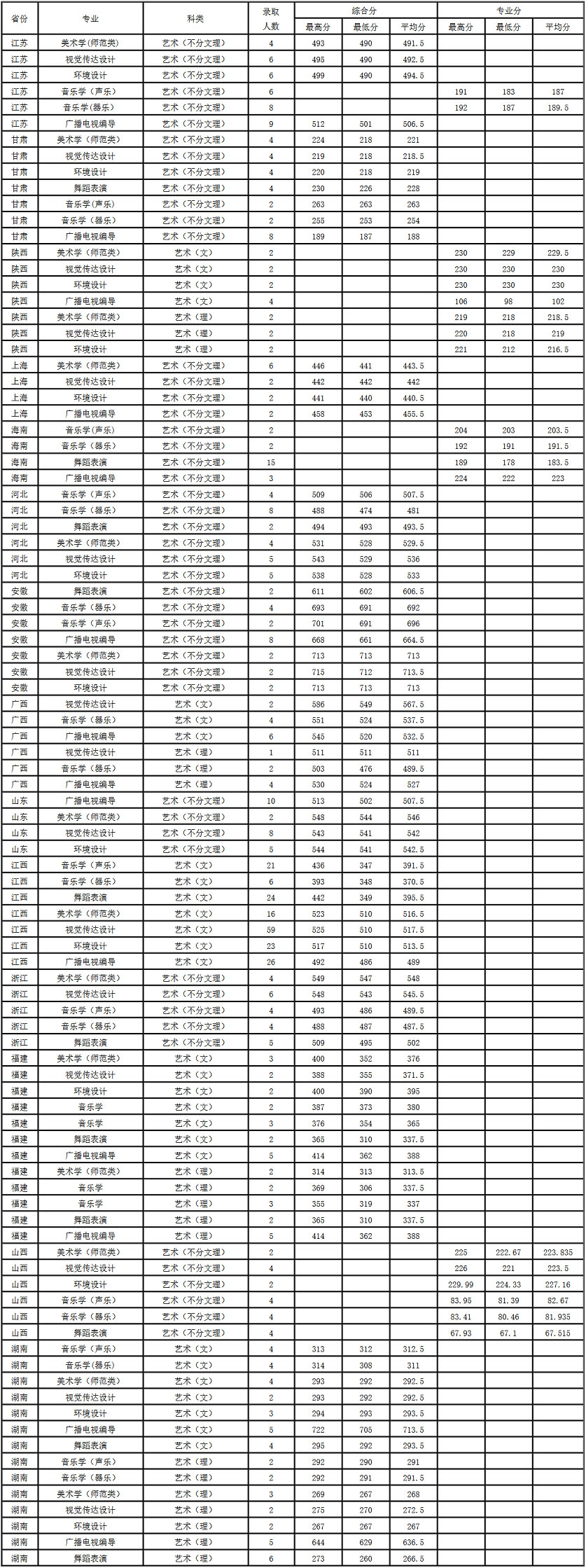 井冈山大学2020年艺术类本科专业录取分数线
