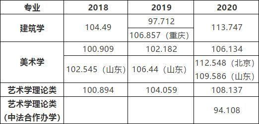 下表是近三年建筑学、美术学、艺术学理论类和艺术学理论类(中法合作办学)专业录取文化课相对成绩分数线: