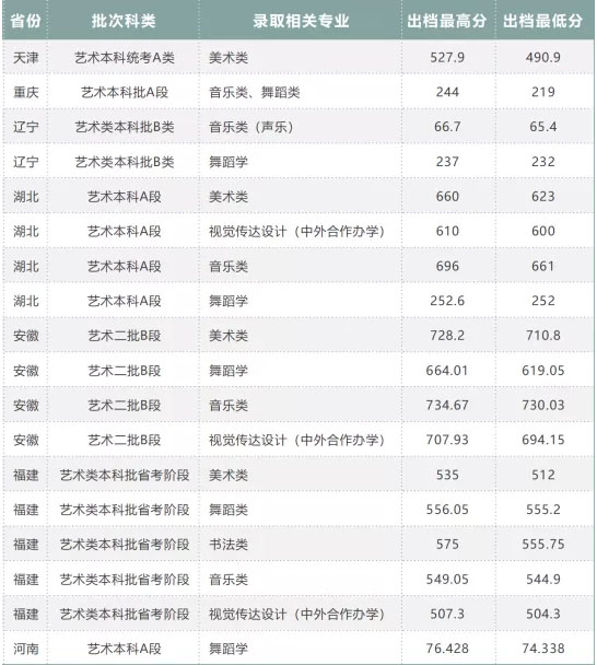 *安徽美术类、舞蹈学、音乐类出档成绩计算方式为:专业成绩/专业满分*700+文化成绩/文化满分*300,其中美术类专业分满分为375分、舞蹈学专业满分200分,音乐类专业满分为210分。