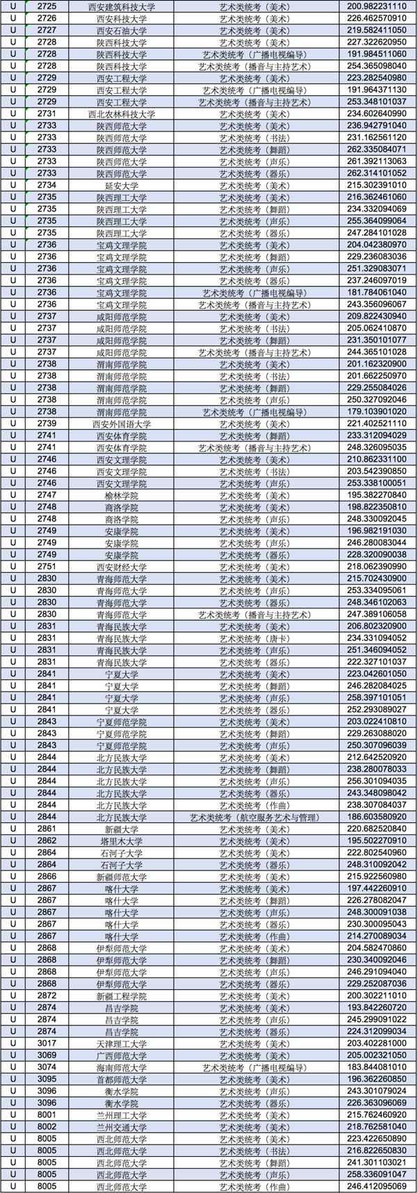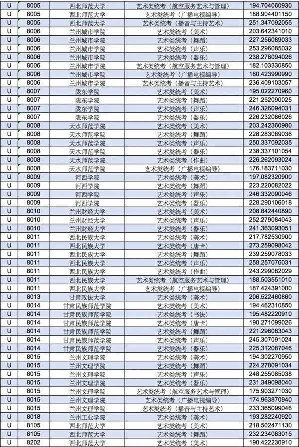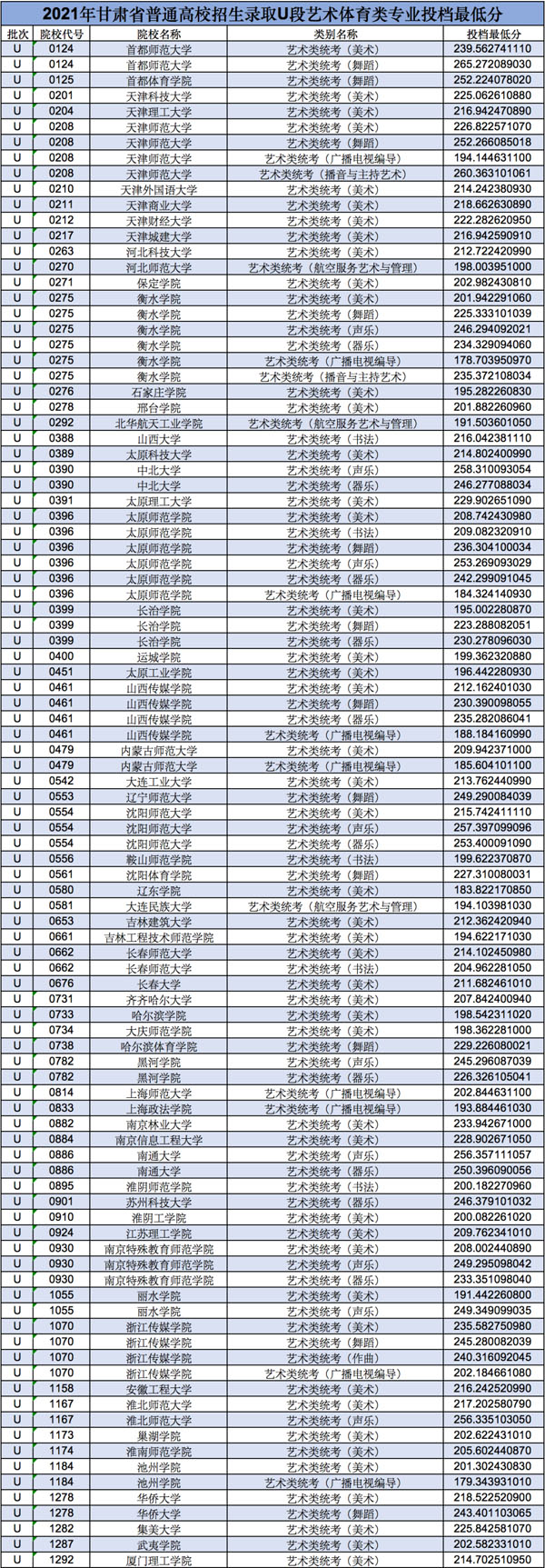 2021年甘肃省普通高校招生录取艺术体育类专业U段分美术、书法、唐卡、声乐、器乐、作曲、广播电视编导、播音与主持艺术、航空服务艺术与管理、舞蹈、田径、篮球足球排球、武术体操等13个类别,按照“分数优先,遵循志愿,一轮投档”的原则投档,即:由高考成绩和专业成绩按照一定比例折算后生成排序成绩,将文化课和专业课双上线的考生按排序成绩分类别从高分到低分排定位次,然后按位次优先的原则,根据考生平行志愿的自然顺序从前到后进行检索,一经检索到计划未满额的学校,即向该校投档。因此,对于考生来说该轮投档只有一次投档机会,个别已经投档的考生会因专业不服从调剂或不符合院校相关招生政策等情况被院校退档,会产生空余计划进行征集。此次公布的投档最低分为第一次填报志愿的投档结果。