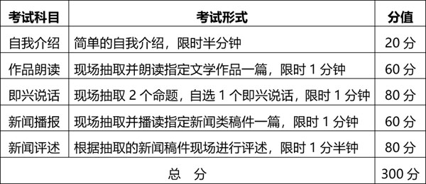 (4)考试:每组考生将分别在2个面试考室参加自我介绍、作品朗读、即兴说话、新闻播报与新闻评述五个科目的面试。作品朗读、即兴说话、新闻播报与新闻评述为现场抽取试题。