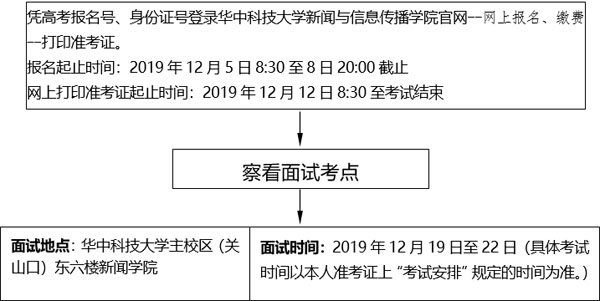 4.打印准考证:考生报名成功后,可于2019年12月12日8:30至考试结束,登录华中科技大学新闻与信息传播学院官网,自行下载打印准考证。