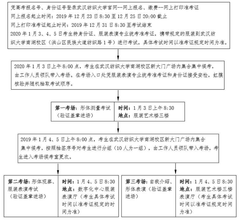 取得艺术类高考报名号并完成普通高考报名的考生,于2019年12月23-25日(12月23日8:30开始,12月25日20:00截止),凭高考报名号及身份证号登录武汉纺织大学官网(网址www.wtu.edu.cn),进行专业统考报名,填报相关信息并完成网上缴费。网报结束后,系统将自动关闭,未在规定时间内完成网上报名或网上缴费的考生,视为未报名,不予安排考试。