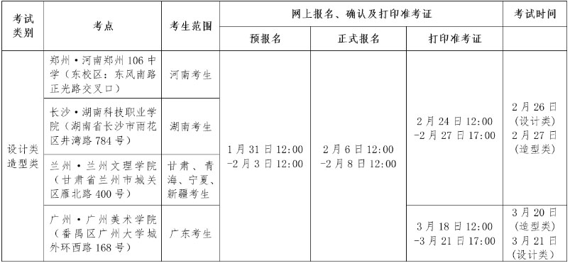 为深入贯彻落实《教育部办公厅关于做好2021年普通高校部分特殊类型招生工作的通知》等文件精神,做好新冠肺炎疫情防控常态化下的招生考试工作,经学校研究决定,现就四川美术学院2021年长沙、兰州、郑州、广州考点造型类、设计类本科招生专业考试相关事宜公告如下,其他各省(自治区、直辖市)的考试方式及报名考试时间将另行公告。