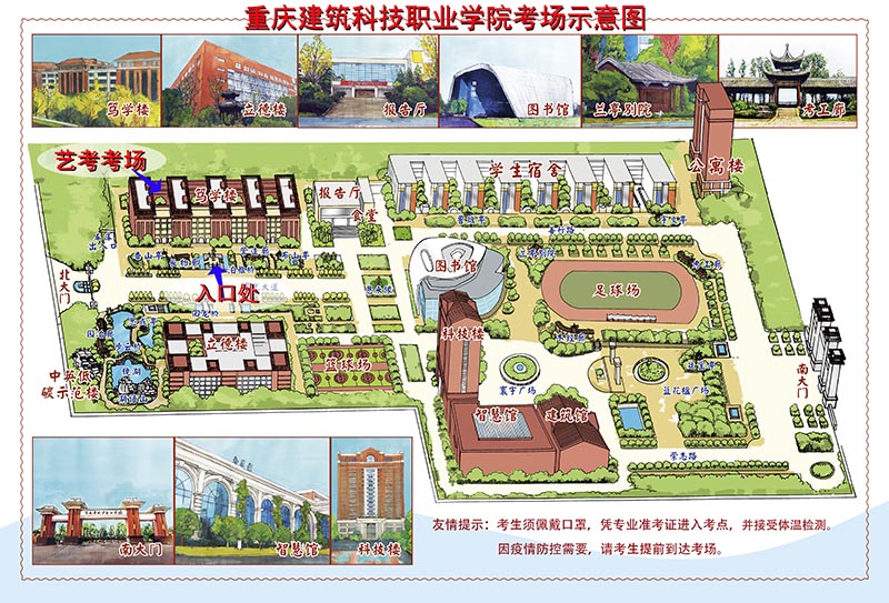 2、考前1小时开始进入考点,在重庆建筑科技职业学院南门、北门依次排队进入,其它校门不对外开放,考生凭“渝康码”绿码、通信大数据行程卡、准考证进入校园,请考生全面考量考试当天交通状况以及进入考点的防疫检测程序,充分估算到达考场时间,切勿迟到,建议至少提前1小时以上错峰进入考点。