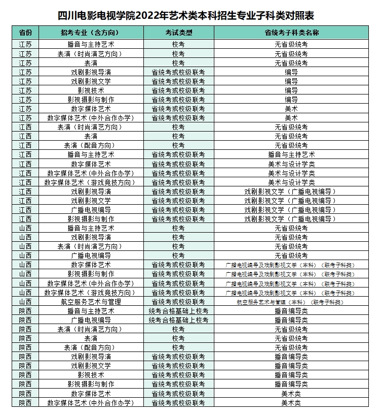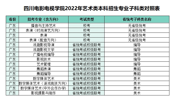 各省具体的招生专业、考试科目、考试安排以及录取原则等,均以我校正式公布的艺术类专业招生简章为准。各省艺术类专业在各省(区、市)计划投放情况以当地招办(考试院)公布的高考招生计划为准。请考生密切关注我校“四川电影电视学院招生就业信息网” https://zjc.sfc.edu.cn/ 和“四川电影电视学院招生办”微信公众号。