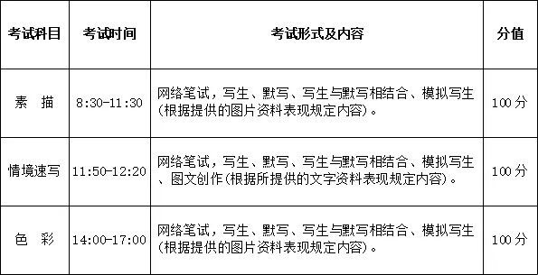 (3)成绩评定与权重:满分为100分,其中:构图比例约占15%;透视与结构约占35%;人物整体动态效果约占25%;速写表现技法约占25% 。