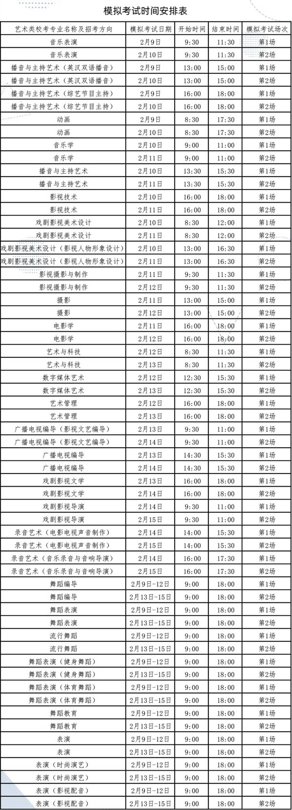 模拟考试从2月9日至2月15日结束。每个专业均有两次模拟考试机会。各专业详细模拟考试时间见《模拟考试时间安排表》: