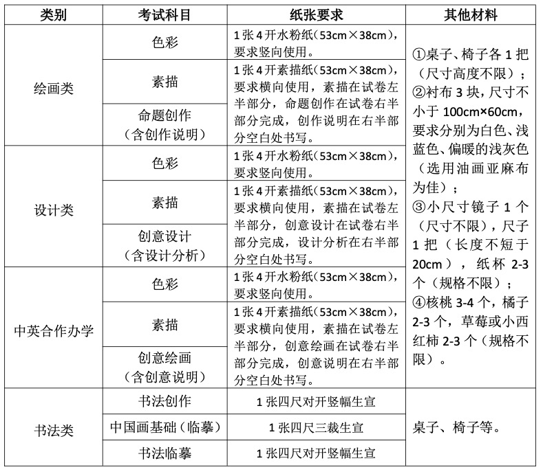 1.素描只允许使用黑色铅笔、黑色炭笔;色彩使用水粉、丙烯、水彩均可,不允许使用油画颜料;命题创作(创意设计、创意绘画)使用马克笔、彩色铅笔、水粉、丙烯、水彩、黑色铅笔、炭笔均可,不允许使用油画颜料;书法创作、书法临摹使用毛笔、墨汁、砚、画毡;中国画基础(临摹)使用毛笔、中国画颜色、墨汁、画毡。