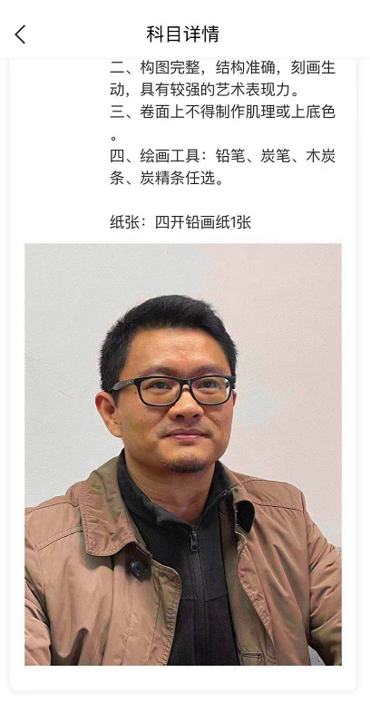 考试题目:人物头像素描,提供人物彩色照片,戴眼镜的男老师