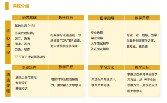 课程拥有治学严谨、水平一流的中外名师团队,根据十多年的教学经验并针对法国留学专门研发了一套特有的教学体系,着重夯实语言基础的大前提下,同时培养学生的文化、学术方法、面试技巧等,根据学生的实际情况和校方的具体要求,全面提高学生综合素质,帮助学生更轻松地通过使馆面签、更容易地融入法国新的学习生活。