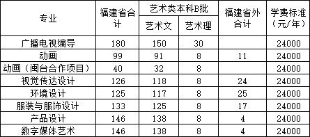 2.我校在福建省艺术类招考中安排在本科批B类(含美术类、编导类)录取,录取实行按专业志愿“一档多投”,专业成绩以福建省统考成绩为准,投档时文化成绩和专业成绩均要求不低于福建省艺术类本科控制线(以福建省教育考试院公布为准,若出现生源不足时,根据福建省教育考试院规定予以降分录取)。