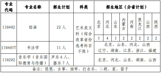 4.考生若报考所在地省级统考已涵盖的专业,须参加省级统考且成绩合格。学校各专业与省级统考科类对应关系如下:绘画为美术学和设计学类、书法学为书法学专业、音乐学(音乐国际教育与传播)为音乐学类。