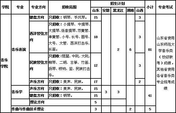 山东省教育招生考试院按艺术类投档规则向我校投档,入档考生我校将按照专业志愿优先的原则,根据专业统考(联考)成绩由高到低择优录取。若专业统考(联考)成绩相同,依次比对高考文化成绩、高考文化成绩位次,成绩或位次排序靠前者优先录取。其中报考音乐学(理论方向)专业的考生,其高考文化课成绩须达到400分以上(含400分),未达到者不予录取。专业主项不在招收范围的考生,将退档不予录取。