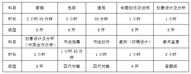 4、各大类(不含史论类和中英合作办学)专业总分为 400 分,除书法学专业外,素描、速写、 色彩、命题创作(含创作说明)、创意设计(含设计分析)各科满分为 100 分。书法学专业临摹、 速写、创作、篆刻(印稿设计)各科满分为 100 分。史论类总分为 100 分。中英合作办学专业总 分为 100 分。