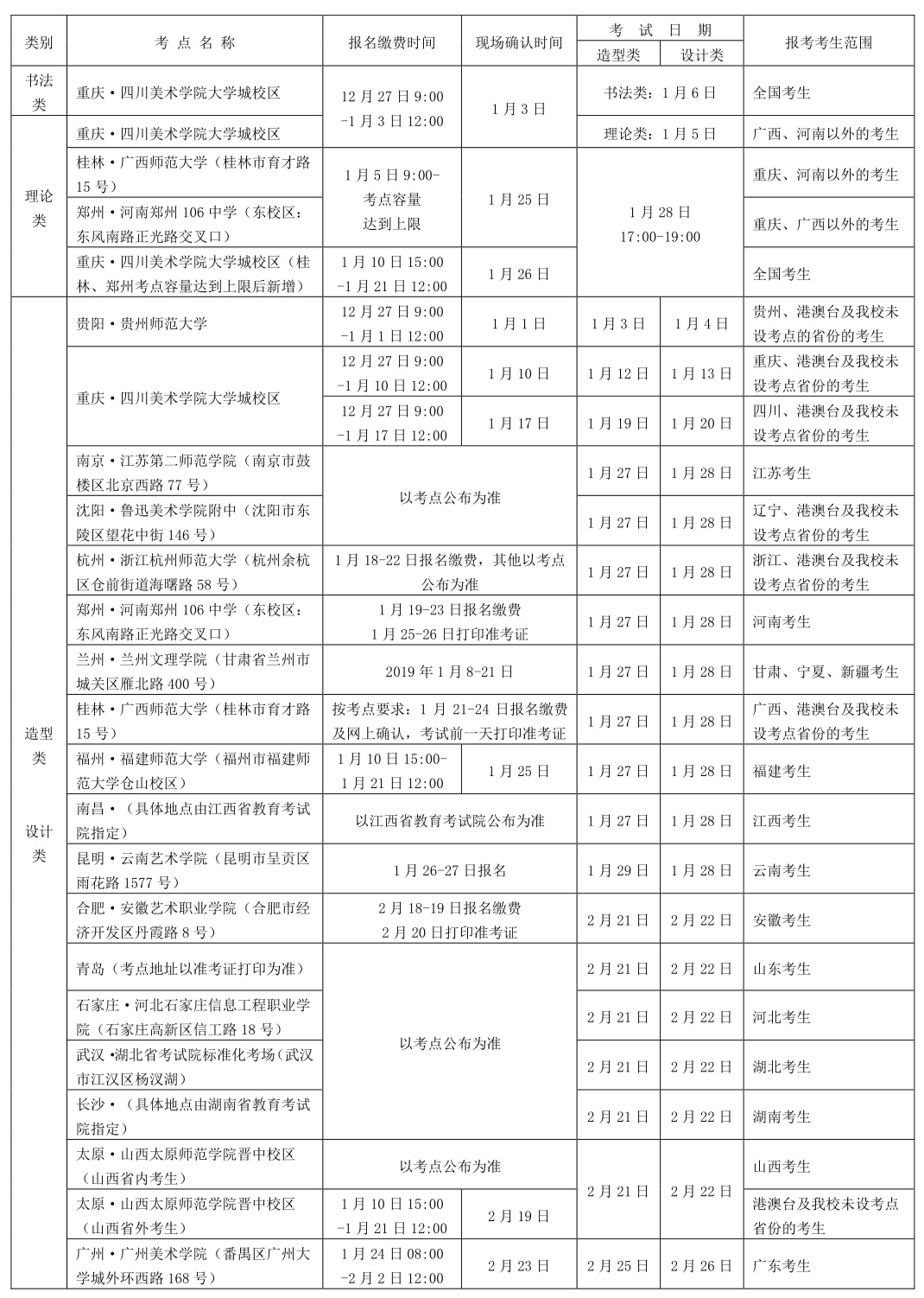 1.考点设置、报名考试时间、报考考生范围见下表。其中,报考造型类、设计类的四川考生,只能参加重庆考点(1月19-20日)的考试。