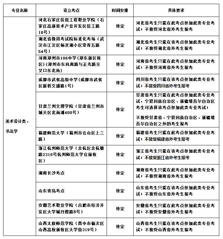 8、我校美术设计类、书法学专业会在部分省份设立考点,具体考试时间安排待确定后将陆续公布,请考生关注我校本科招生网。凡我校在考生高考所在省设有考点的专业,考生只能在本省考点参加专业考试。外省考点所在省份有专门规定,考生须遵照执行。考点具体分布如下: