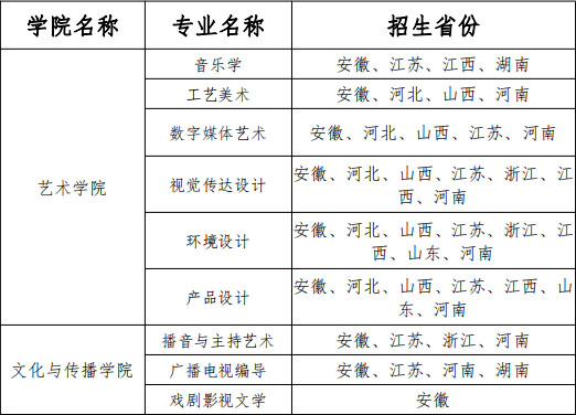 2020年我校艺术类专业面向安徽、河北、山西、江苏、浙江、江西、山东、河南、湖南等9个省(市、自治区)招生,艺术类分文理科的省份仅面向艺术类文科考生招生,不分文理科的省份不作文理科报考要求,各省份具体的招生专业如下: