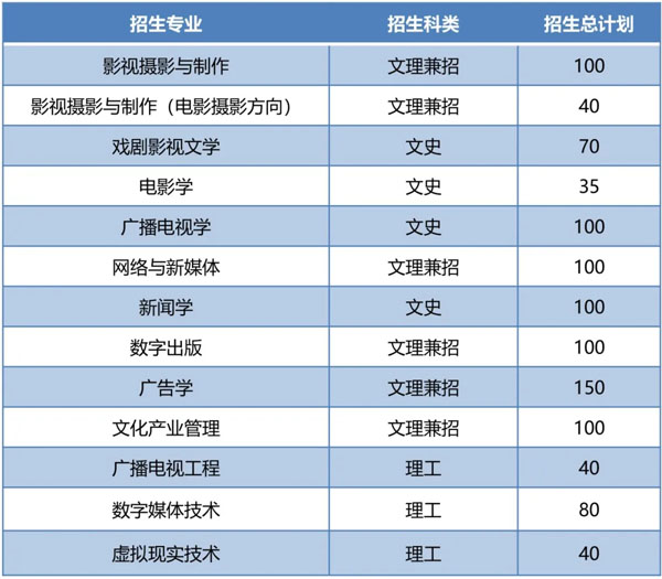 3.戏剧影视导演专业在辽宁、贵州使用戏剧影视导演统考成绩,其他省份使用当地广播电视编导类统(联)考成绩。平行志愿投档的省份按投档成绩由高到低录取;非平行志愿投档的省份按进档考生高考文化成绩由高到低录取。