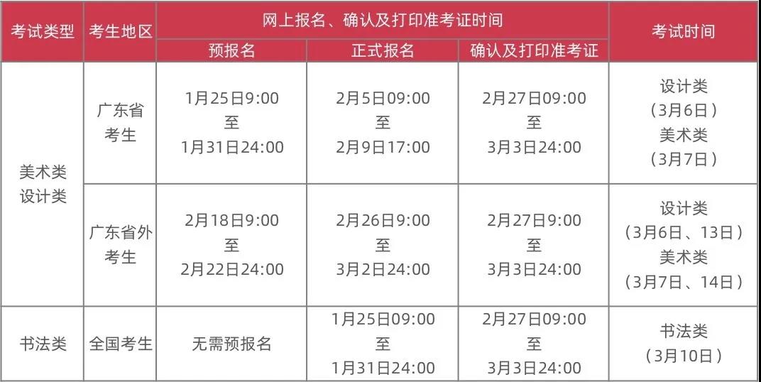 报考“美术类”“设计类”专业的考生须先进行预报名,学校根据预报名人数、属地疫情防控工作要求和教育部有关规定,采用各省级美术学和设计学类统考成绩进行初选并公布初选结果,已完成预报名并符合初选要求的考生方可正式报名参加考试;报考“书法类”的考生无需进行预报名,直接选择正式报名。