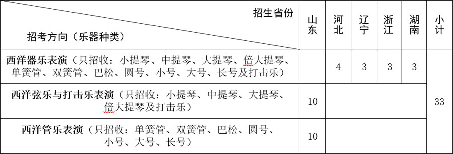 注:2021年,西洋器乐表演方向在山东省分西洋弦乐与打击乐表演、西洋管乐表演2个方向招生,请仔细对照具体的招考方向与计划数量。