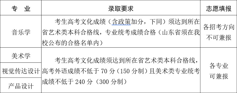 2021年起,我校艺术类各专业全部使用各省统考成绩录取(山东省音乐学专业为我校重新计算的专业成绩,方法见“报考条件”),不再单独组织专业校考。