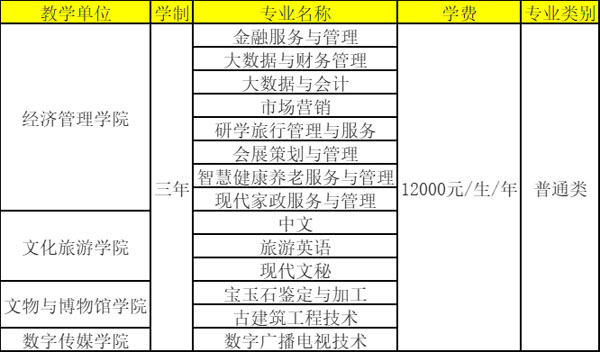 金融工程、市场营销、文化产业管理、公共事业管理、物流管理、会展经济与管理、民族学、文物与博物馆学、宝石及材料工艺学、汉语国际教育、英语、广播电视工程、风景园林、应用心理学、艺术教育本科专业;金融服务与管理、大数据与财务管理、大数据与会计、市场营销、会展策划与管理、智慧健康养老服务与管理、现代家政服务与管理、研学旅行管理与服务、中文、旅游英语、现代文秘、宝玉石鉴定与加工、古建筑工程技术、数字广播电视技术:只需参加全国普通高等学校招生统一文化考试。