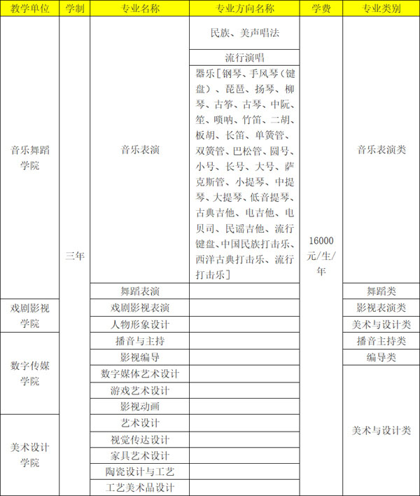 学校专业设置科学、时尚,涵盖艺术学、经济学、法学、教育学、文学、历史学、工学和管理学八大本科学科门类与文化艺术、新闻传播、资源环境与安全、土木建筑、财经商贸、旅游和教育与体育七大专科学科门类,涉及音乐与舞蹈学类、戏剧与影视学类、美术学类、设计学类、金融学类、民族学类、教育学类、中国语言文学类、外国语言文学类、历史学类、材料类、电子信息类、建筑类、工商管理类、公共管理类、物流管理与工程类、旅游管理类、艺术设计类、表演艺术类、广播影视类、资源勘查类、建筑设计类、金融类、财务会计类、市场营销类、旅游类、会展类、语言类、文秘类和体育类等三十个本、专科专业类别。