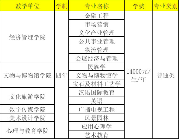 金融工程、市场营销、文化产业管理、公共事业管理、物流管理、会展经济与管理、民族学、文物与博物馆学、宝石及材料工艺学、汉语国际教育、英语、广播电视工程、风景园林、应用心理学、艺术教育本科专业;金融服务与管理、大数据与财务管理、大数据与会计、市场营销、会展策划与管理、智慧健康养老服务与管理、现代家政服务与管理、研学旅行管理与服务、中文、旅游英语、现代文秘、宝玉石鉴定与加工、古建筑工程技术、数字广播电视技术:只需参加全国普通高等学校招生统一文化考试。