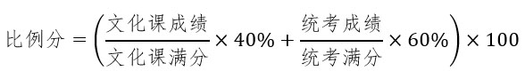 在实行平行志愿的省份,按照投档成绩从高到低的顺序择优录取。在实行顺序志愿的省份,按照比例分(四舍五入、保留小数点后两位)从高到低的顺序择优录取。比例分满分为100分,计算公式为: