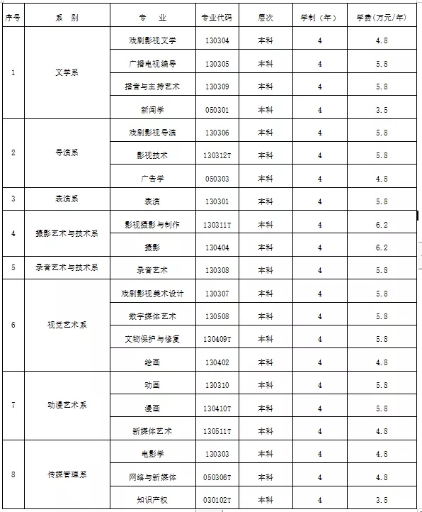 戏剧影视文学、广播电视编导、播音与主持艺术、戏剧影视导演、影视技术、表演、摄影、影视摄影与制作、录音艺术、戏剧影视美术设计、数字媒体艺术、文物保护与修复、绘画、动画、漫画、新媒体艺术、电影学专业文化考试成绩要求达到当年各省普通高等学校艺术类专业文化录取控制分数线,对进档考生原则上按照志愿优先,根据专业成绩排序,择优录取;学校在招生录取和安排专业时,相同条件下优先考虑高考文化总分成绩高的考生,高考文化成绩相同者,优先考虑语文成绩高的考生。