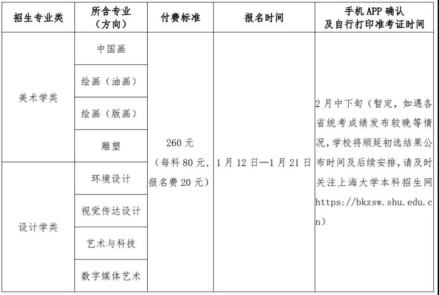 美术学类【中国画、绘画(油画)、绘画(版画)、雕塑】、设计学类【环境设计、视觉传达设计、艺术与科技、数字媒体艺术】专业投档至上海大学的考生:
