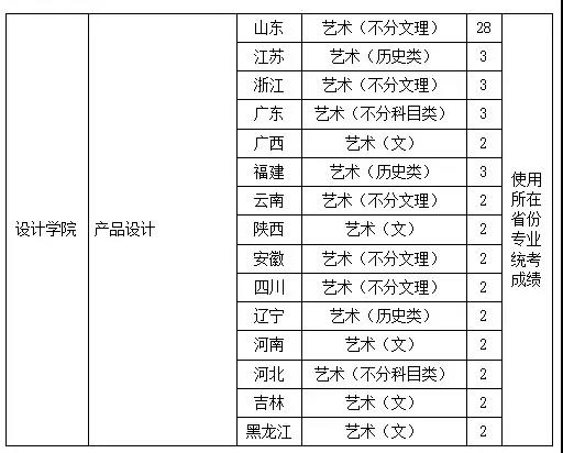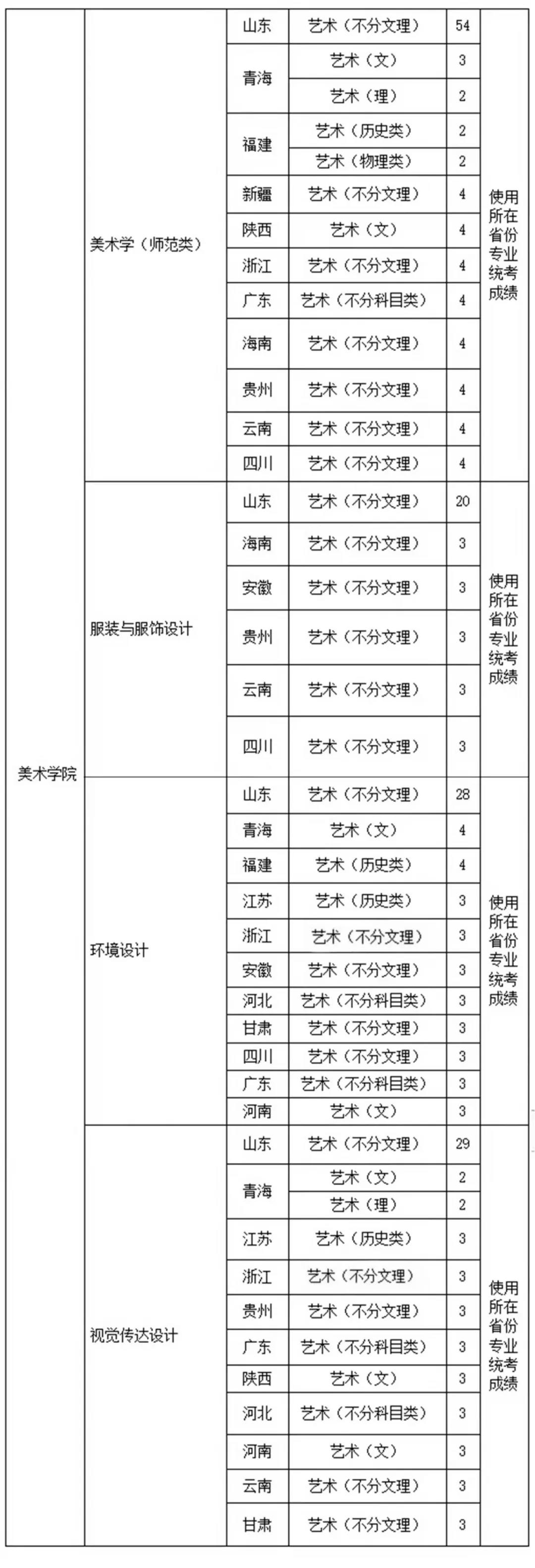 美术学(师范类)、服装与服饰设计、环境设计、视觉传达设计、产品设计专业使用招生省份美术类专业统考成绩,音乐学(师范类)专业使用招生省份音乐类专业统考(或联考)成绩,舞蹈学(师范类)专业使用招生省份舞蹈类专业统考(或联考)成绩。